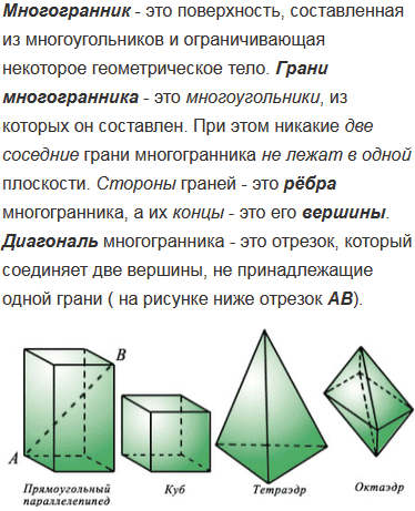 Объясните, что такое многогранник; что такое грани, ребра, вершины и диагонали многогранника. Приведите примеры многогранников.