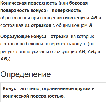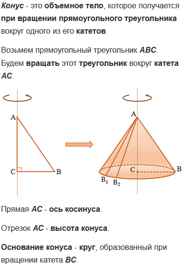 Объясните, какое тело называется конусом; что такое ось, высота, основания, боковая поверхность, образующие конуса.