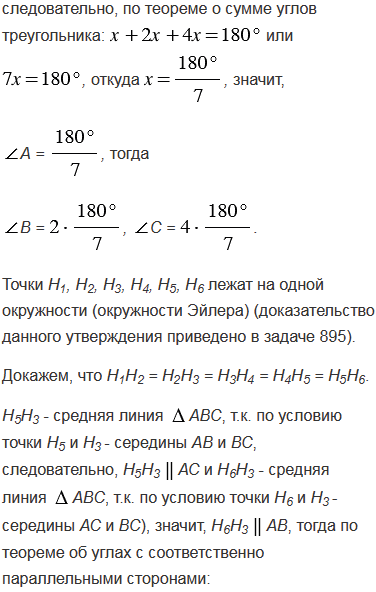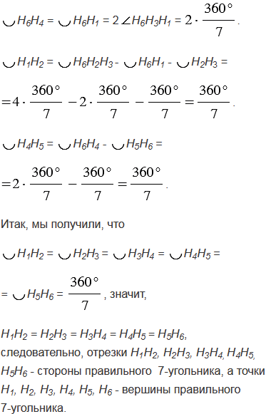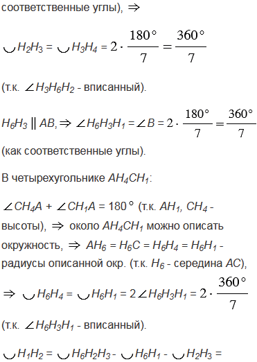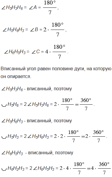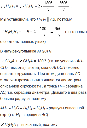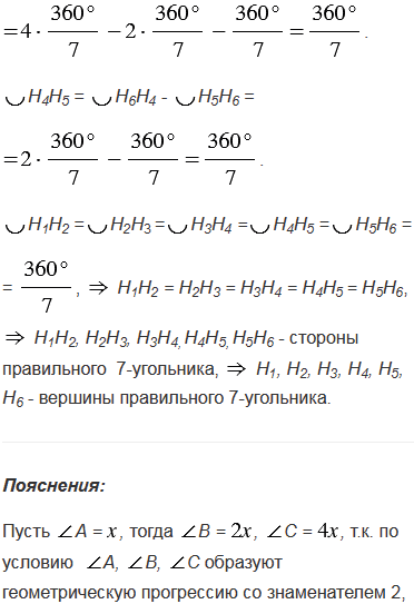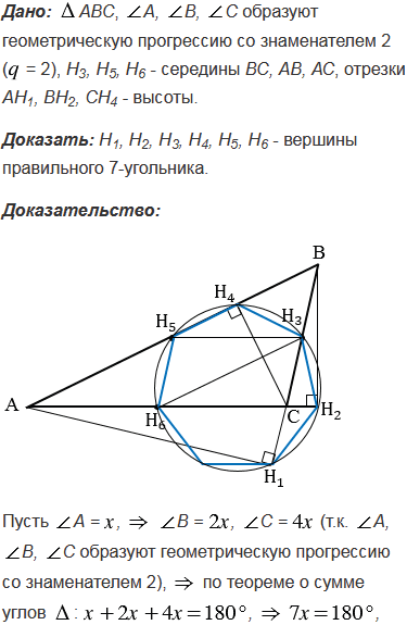 Углы треугольника образуют геометрическую прогрессию со знаменателем 2. Докажите, что середины сторон и основания высот этого треугольника являются шестью вершинами правильного семиугольника.