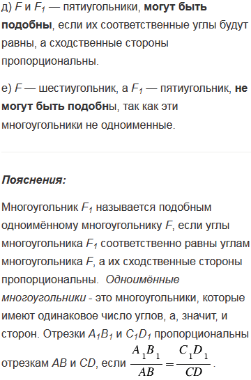 Могут ли быть подобными многоугольники F и F1, если: а) F — остроугольный, а F1 тупоугольный треугольники; б) F равносторонний треугольник, а F1 равнобедренный, но не равносторонний треугольник; в) F — прямоугольник, а F1 квадрат; г) F и F1 — прямоугольники; д) F и F1 пятиугольники; е) F шестиугольник, а F1 пятиугольник. Ответ обоснуйте.