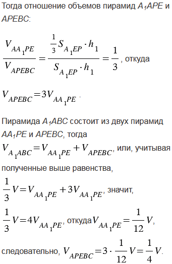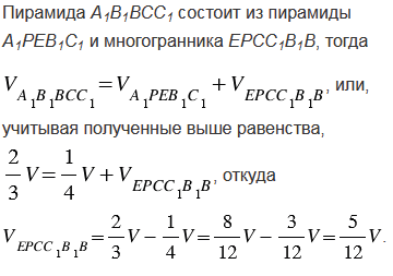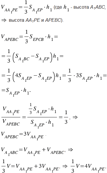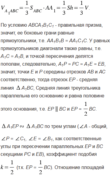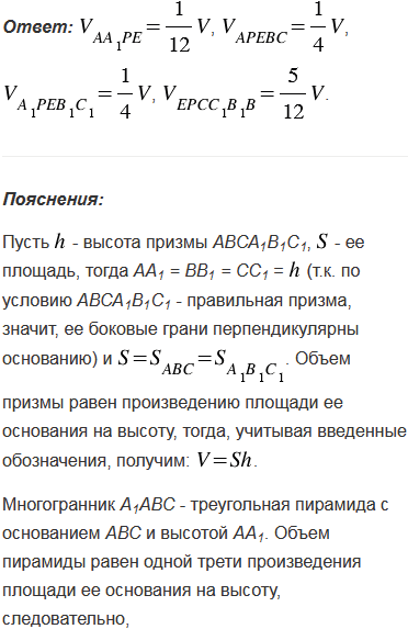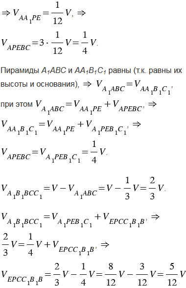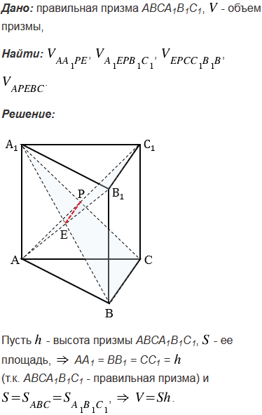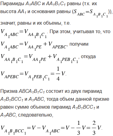 Плоскости АВ1С1 и А1ВС разбивают правильную треугольную призму АВСА1В1С1 на четыре части. Найдите объемы этих частей, если объем призмы равен V.