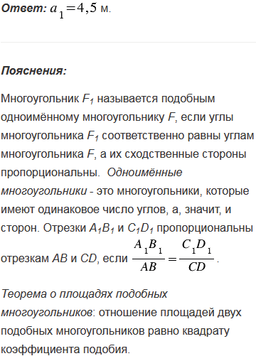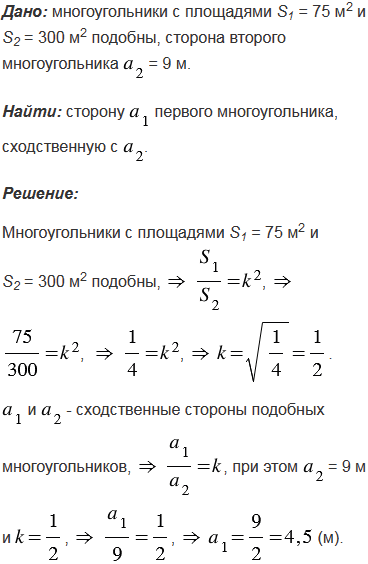 Площади подобных многоугольников равны 75 м2 и 300 м2.Одна из сторон второго многоугольника имеет длину 9 м. Найдите длину сходственной стороны первого многоугольника.