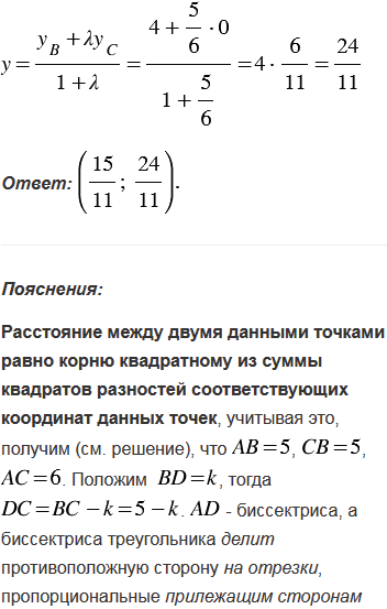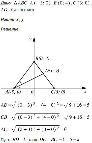 Вершины треугольника АВС имеют координаты А(-3; 0), В(0; 4), С(3; 0). Биссектриса угла А пересекает сторону ВС в точке D. Найдите координаты точки D.