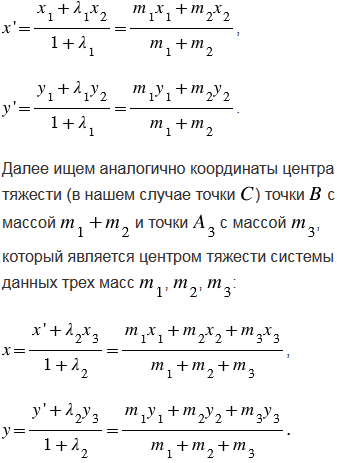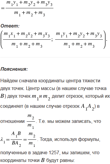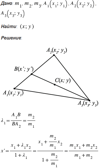 Найдите координаты центра тяжести системы трёх масс m1, m2 и m3, сосредоточенных соответственно в точках A1(x1; y1), А2(x2; y2), А3(x3; y3).