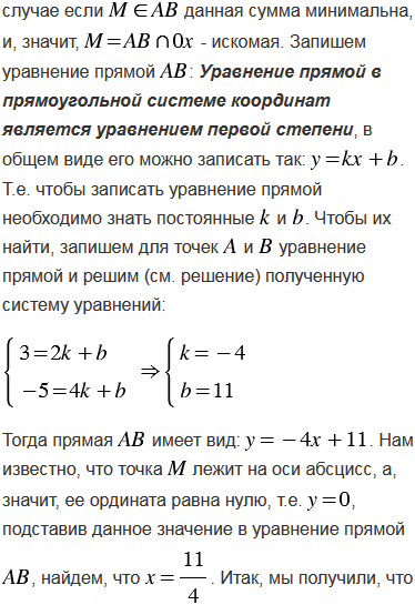 В каждом из следующих случаев на оси абсцисс найдите точку М, для которой сумма её расстояний от точек А и В имеет наименьшее значение: