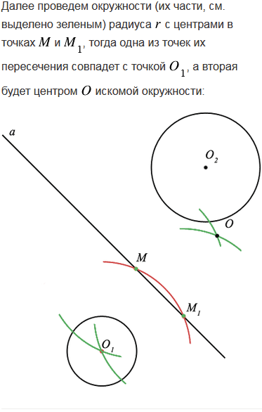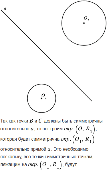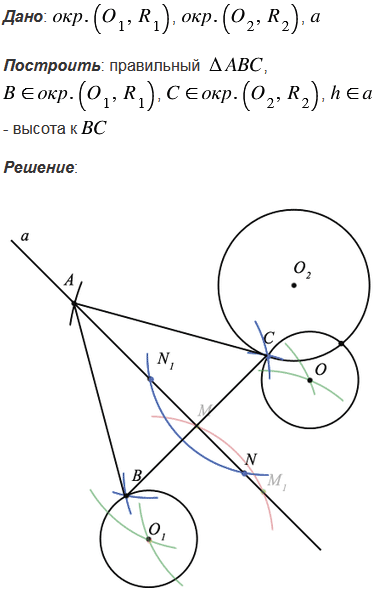 Даны две окружности и прямая. Постройте правильный треугольник так, чтобы две вершины лежали соответственно на данных окружностях, а высота, проведённая из третьей вершины, - на данной прямой.