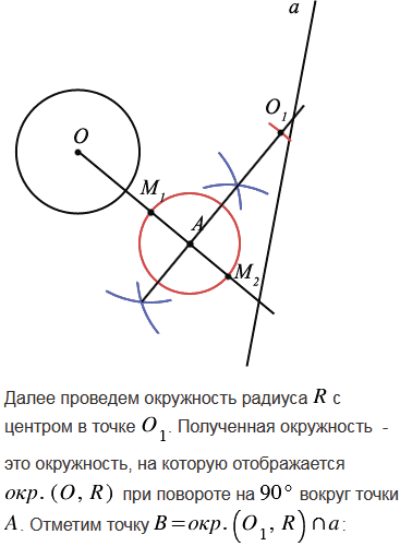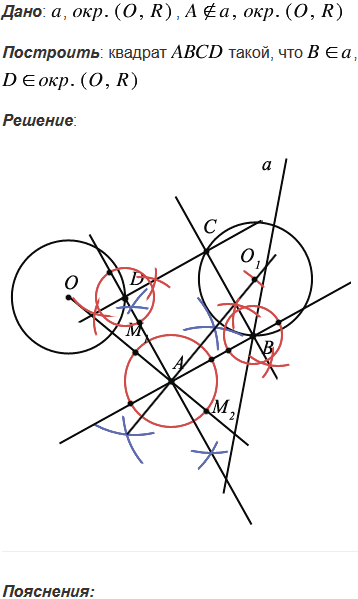 Даны прямая, окружность и точка А, не лежащая на них. Постройте квадрат ABCD так, чтобы вершина В лежала на данной прямой, а вершина D - на данной окружности.