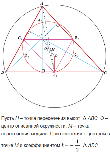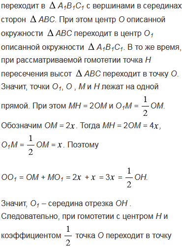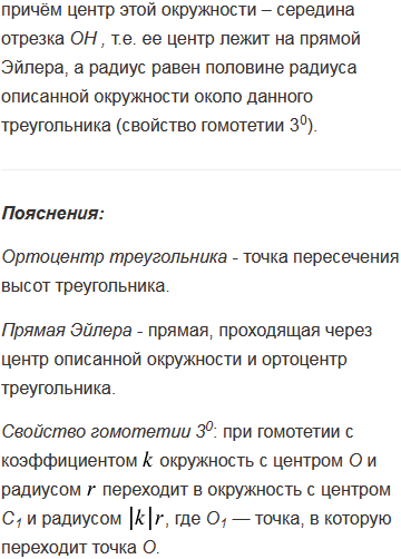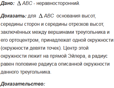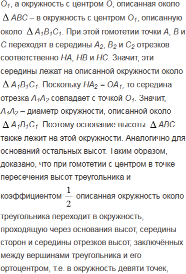 Пользуясь результатом задачи 909, применяя гомотетию, докажите, что для неравностороннего треугольника основания высот, середины сторон и середины отрезков высот, заключённых между вершинами треугольника и его ортоцентром, принадлежат одной окружности (окружности девяти точек). Центр этой окружности лежит на прямой Эйлера, а радиус равен половине радиуса описанной окружности данного треугольника.