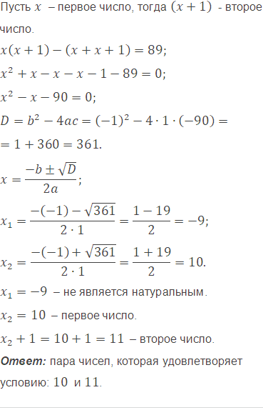 Произведение двух последовательных натуральных чисел на 89 больше их суммы. Найдите эти числа.
