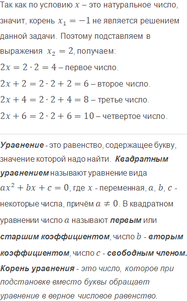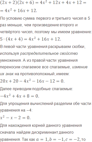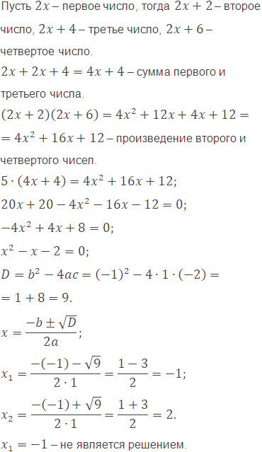 Найдите четыре последовательных чётных натуральных числа, если сумма первого и третьего чисел в 5 раз меньше, чем произведение второго и четвёртого чисел.