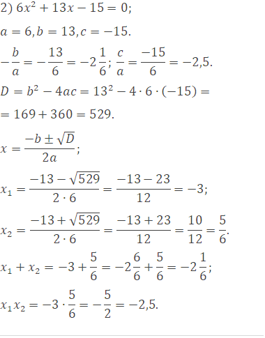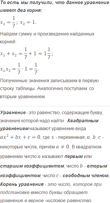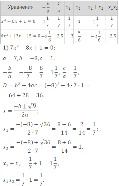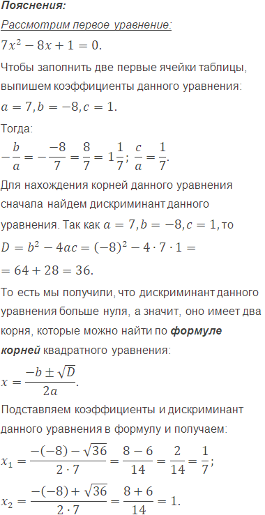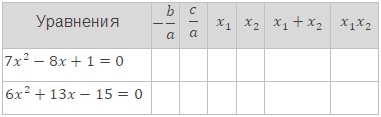 Заполните таблицу, где , и - коэффициенты квадратного уравнения , а и - его корни.