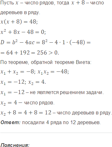 В саду посадили рядами 48 деревьев с одинаковым количеством деревьев в каждом ряду. Рядов оказалось на 8 меньше, чем деревьев в каждом из них. Сколько деревьев посадили в каждом ряду и сколько было рядов?
