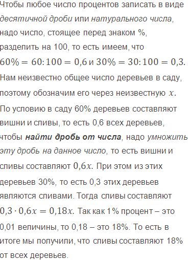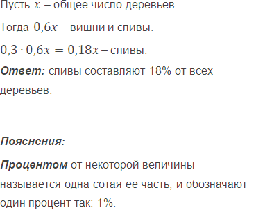 В саду 60% деревьев составляют вишни и сливы, из них 30% составляют сливы. Какой процент всех деревьев сада составляют сливы?