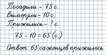 3. Из посаженных в парке 75 саженцев зимой вымерзли 10. Сколько саженцев прижилось?