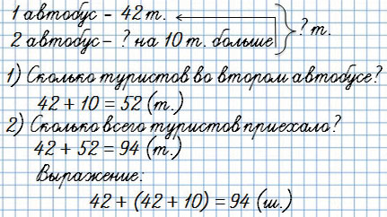 2. На одном автобусе в Псков приехали 42 туриста, а на другом на 10 туристов больше. Сколько всего туристов ... ?