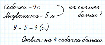 7. В цирковом представлении выступали 9 собачек и 5 медвежат. На сколько больше собачек, чем медвежат, выступали в этом цирковом представлении?