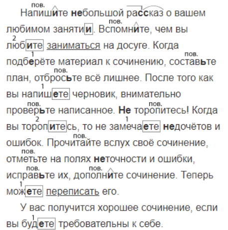 Напиш..те (не)большой ра(с,сс)каз о вашем любимом занята..3. Вспомн..те, чем вы люб..те зан..маться на досуге. Когда подб..рёте2 материал к сочинению, состав..те план, отброс..те всё лишнее. После того как вы напиш..те черновик, внимательно провер..те написанное. (Не)торопитесь! Когда вы тороп..тесь, то не замеча..те (не)дочётов и ошибок. Прочитайте вслух своё сочинение, отметьте на полях (не)точности и ошибки, исправите их, дополн..те сочинение. Теперь мож..те переписать его.