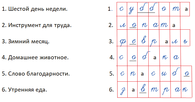 Прочитайте. Впишите в пустые клетки слова, соответствующие данным значениям.
