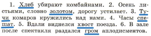 1. Хлеб убирают комбайнами. 2. Осень листьями, словно золотом, дорогу устилает. 3.Тучи комаров кружились над нами. 4. Часы спешат. 5. Вдали виднелся хвост поезда. 6. В зале после спектакля раздался гром аплодисментов.