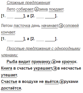 1. Рыба видит приманку а не крючок.5 2. Книга в счаст(?)е украша..т а в несчастье утеша..т. 3. Лето собира..т а зима поеда..т2. 4. Счаст(?)е в воздухе не в(?)ётся а руками достаётся. 5. Летом ласточка день начина..т а соловей конча..т.