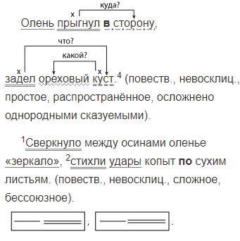 Два сливовых глаза глядели на меня не моргая. Ноздри тянули воздух и выпускали две струйки морозного пара. ...Я почти (не)дышал (не)шевелился. Оленю надоела неясность2. Он шаркнул передней ногой и опять замер. (Не)знаю, чем бы кончилось единоборство двух пар любопытных глаз, но откуда-то появилась сойка и ошалело застрекотала. А это в лесу сигнал: опас(?)ность! Сигнал сорвал (с)места пружину из тугих мускулов. Олень прыгнул (в)сторону задел ореховый куст.4 Сверкнуло между осинами оленье «зеркало», стихли удары копыт (по)сухим листьям.4 Сойка с минуту (не)могла успокоит(?)ся прыгала (по)осине и стрекотала. Лес на два километра вокруг (по)этому крику знал: что-то случилось.
