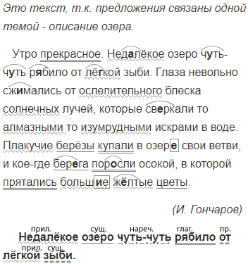 Утро прекрасное. Недалёкое озеро ч..ть-ч..ть р..било2 от лё..кой зыби.4 Глаза невольно сж..мались от сл..пительного блеска солнечных лучей1, св..ркавших то алмазными, то изумрудными искрами в воде. Пл..кучие берёзы купали в озер.. свои ветви, и кое-где бер..га пор..ели осокой, в которой прятались больш..е ж..лтые цветы...