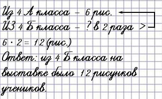 На выставке было 6 рисунков учеников из 4 А класса, а рисунков учеников из 4 Б в 2 раза больше. Сколько было на выставке рисунков учеников из 4 Б класса?