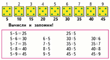 6 • 5 = 30 5 • 9 = 45 15 : 5 = 3 35 : 5 = 7 36 : 4 = 9