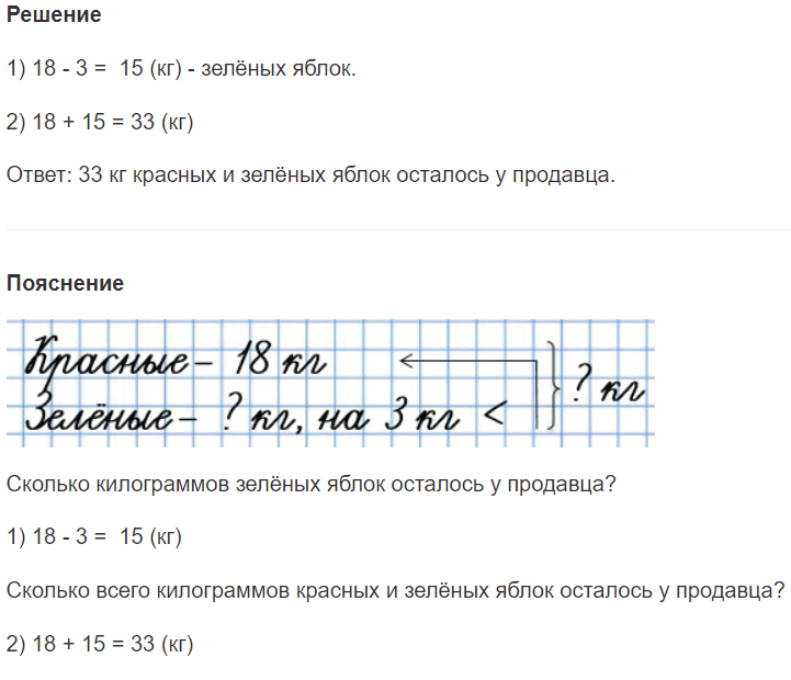 5. У продавца осталось 18 кг красных яблок, а зелёных — на 3 кг меньше. Сколько всего килограммов красных и зелёных яблок осталось у продавца?