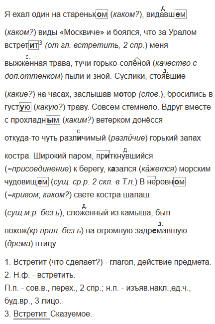 1. Я ехал один на стареньк..м видавш..м виды «Москвиче» и боялся, что за Уралом встрет..т3 меня выжженная трава, тучи (горько)солё(н, нн)ой пыли и зной. 2. Суслики стоявш..е на часах заслышав м..тор, бросились в густ..ю траву. 3. Совсем стемнело. Вдруг вместе с прохладн..м ветерком донёсся откуда-то чуть разл..чимый горький запах костра. 4. Широкий паром пр..ткнувшийся к берегу к..зался морским чудовищ..м. 5. В (не)ровн..м свете костра шалаш(?) сложенный из камыша был похож(?) на огромную задр..мавшую птицу.