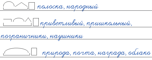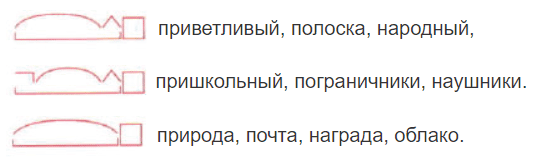 Выделим в словах значимые части слов: приветливый, пришкольный, природа, почта, пограничники, полоска, народный, награда, наушники, облако.