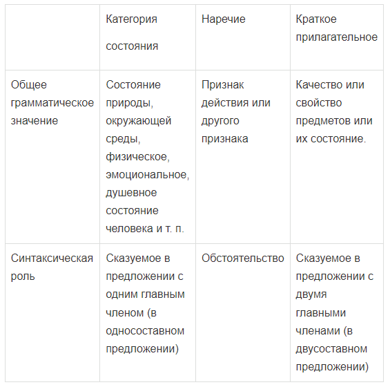 Общее грамматическое значение Состояние природы, окружающей среды, физическое, эмоциональное, душевное состояние человека и т. п. Признак действия или другого признака