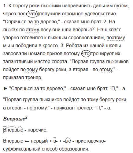 1. К берегу реки лыжники направились дальним путём, через лес, (за)то получили огромное удовольствие. Спряч(?)ся (за)то дерево ск..зал мне брат. 2. На лыжах (по)этому лесу они шли впервые2. Наш класс упорно готовился к лыжн..м соревнованиям, (по)этому мы и победили в кросс... 3. Ребята из нашей школы завоевали немало призов (по)тому, что трениру..т их т..лантливый мастер спорта. Первая группа лыжников пойдёт (по)тому берегу реки, а вторая (по)этому пр..казал тренер.