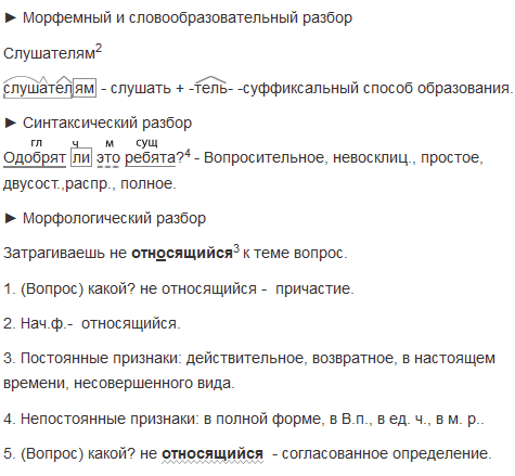 • Суффиксальный: слушатель ← слушать + -тель, рыбацкий ← рыбак (к//ц) + -к-; боронить ← борона + -и-; обдуманно ← обдуманный + -о;