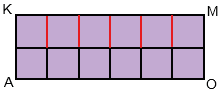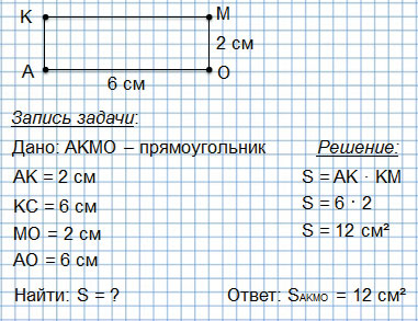 В прямоугольнике АКМО по длине уложилось 6 квадратов площадью 1 см2, а по ширине 2 квадрата площадью 1 см2. Значит, площадь прямоугольника АКМО: