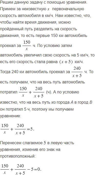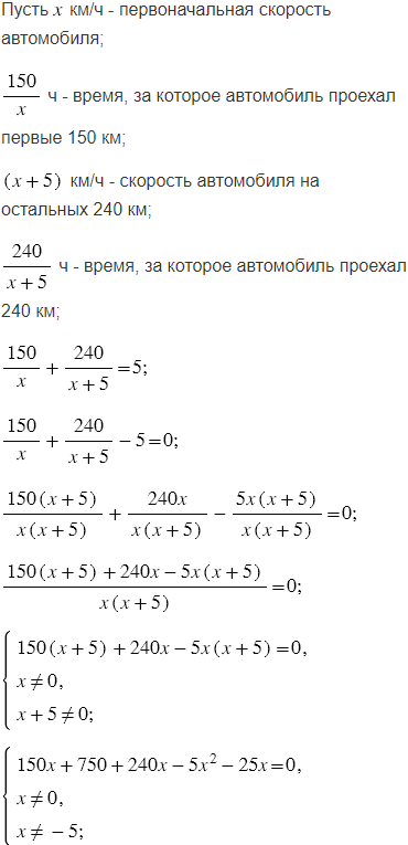 Первые 150 км дороги из города А в город В автомобиль проехал с некоторой скоростью, а остальные 240 км - со скоростью на 5 км/ч большей. Найдите первоначальную скорость автомобиля, если на весь путь из города А в город В он потратил 5 ч.