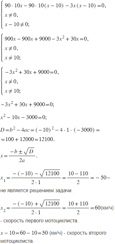 Первый мотоциклист проезжает 90 км на 18 мин быстрее второго, поскольку его скорость на 10 км/ч больше скорости второго мотоциклиста. Найдите скорость каждого мотоциклиста.