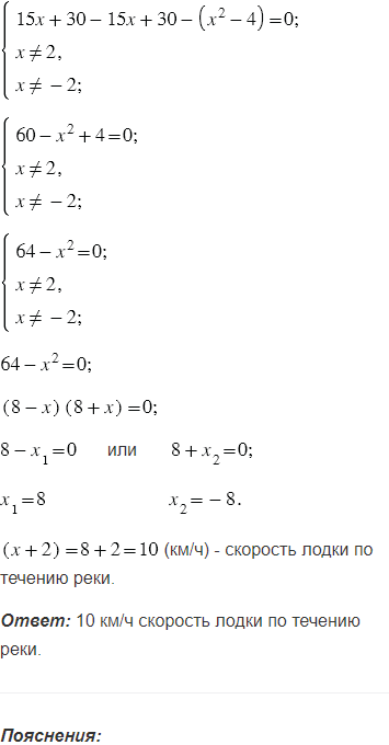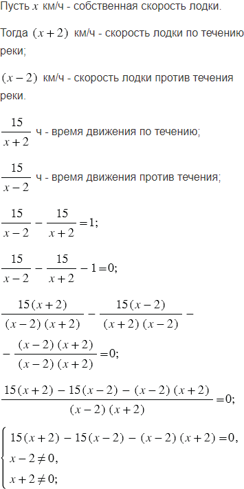 Лодка проплыла 15 км по течению реки и вернулась, затратив на обратный путь на 1 ч больше. Найдите скорость лодки по течению реки, если скорость течения составляет 2 км/ч.