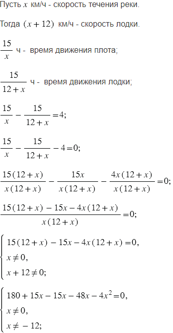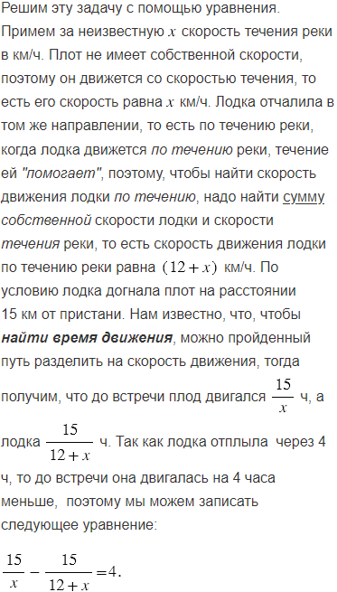 По течению реки от пристани отплыл плот. Через 4 ч от этой пристани в том же направлении отчалила лодка, догнавшая плот на расстоянии 15 км от пристани. Найдите скорость течения реки, если собственная скорость лодки составляет 12 км/ч.