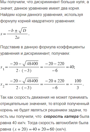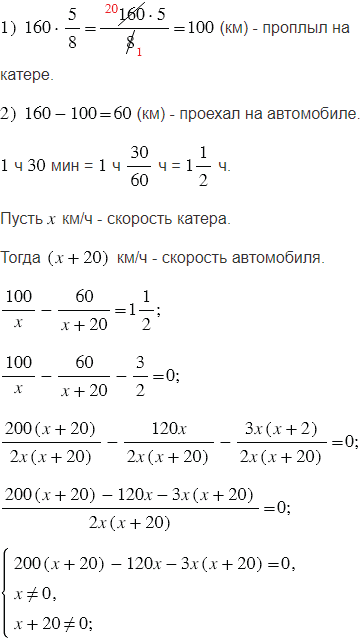 всего пути на катере, а остальную часть проехал на автомобиле. Скорость автомобиля на 20 км/ч больше скорости катера. На автомобиле он ехал на 1 ч 30 мин меньше, чем плыл на катере. Найдите скорость автомобиля и скорость катера, если всего турист преодолел 160 км.
