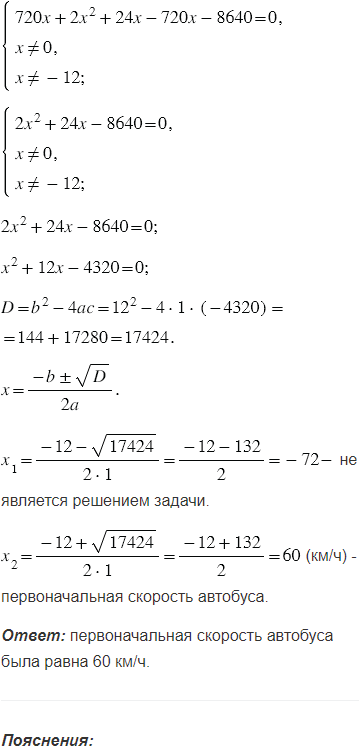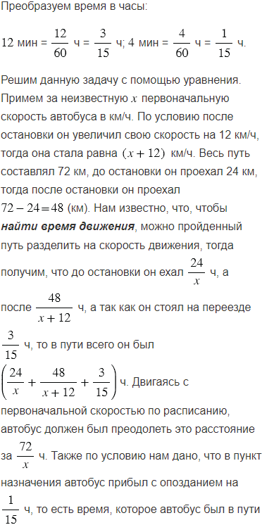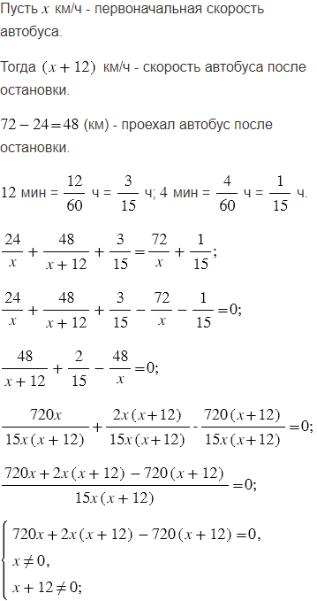 Международный автобус должен был проехать 72 км. После того как он проехал 24 км, его задержали на железнодорожном переезде на 12 мин. Потом он увеличил скорость на 12 км/ч и прибыл в пункт назначения с опозданием на 4 мин. Найдите первоначальную скорость автобуса.