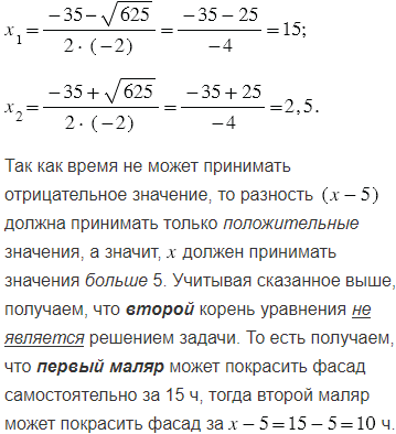 Одному маляру требуется на 5 ч больше, чем другому, чтобы покрасить фасад дома. Когда первый маляр проработал 3 ч, а потом его сменил второй маляр, проработавший 2 ч, то оказалось, что покрашено 40% фасада. За какое время может покрасить фасад каждый маляр, работая самостоятельно?