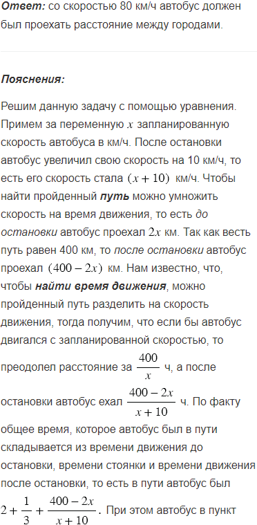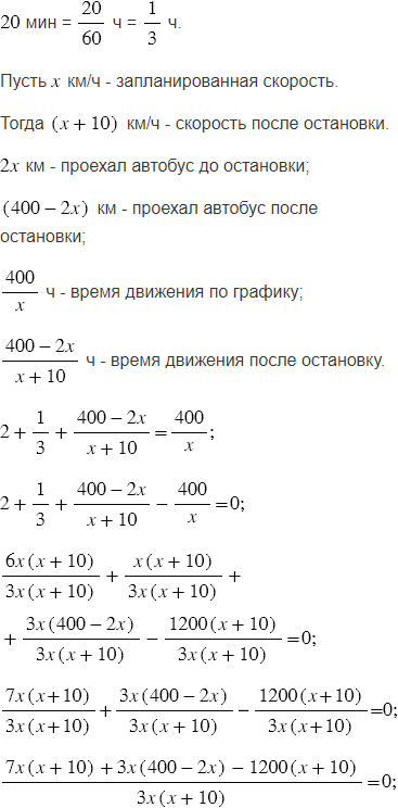 Автобус должен был проехать расстояние между двумя городами, равное 400 км, с некоторой скоростью. Проехав 2 ч с запланированной скоростью, он остановился на 20 мин и, чтобы прибыть в пункт назначения во время, увеличил скорость движения на 10 км/ч. С какой скоростью автобус должен был проехать расстояние между городами?