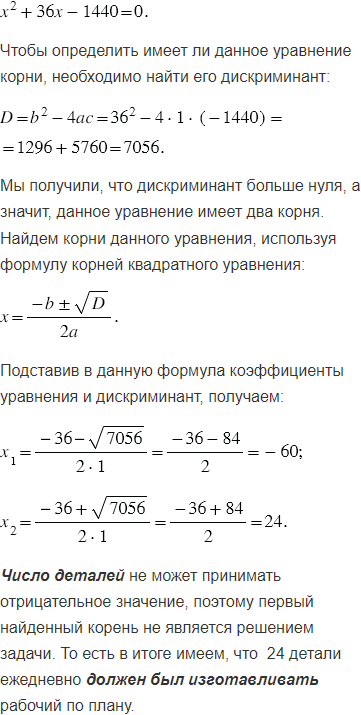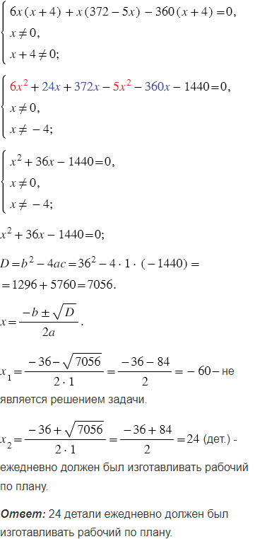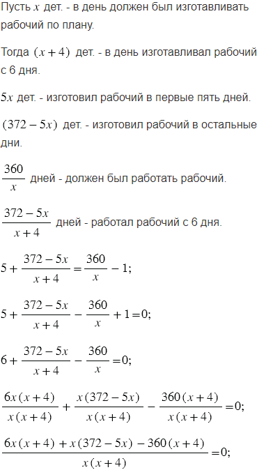 Рабочий должен был за некоторое время изготовить 360 деталей. Первые 5 дней он ежедневно изготавливал запланированное количество деталей, а затем ежедневно изготавливал на 4 детали больше, и уже за день до срока изготовил 372 детали. Сколько деталей ежедневно должен был изготавливать рабочий по плану?