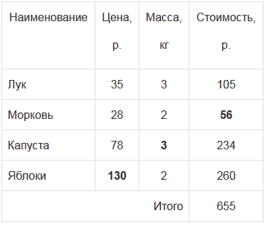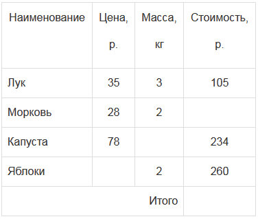 В магазине купили лук, морковь, капусту и яблоки. С помощью таблицы ответьте на вопросы.