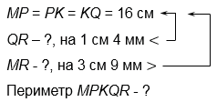 Нам известно, что МР, РK и KQ равны по 16 см, значит, можем записать, что МР = РK = KQ = 16 см.