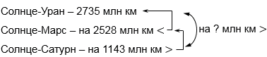Расстояние от Урана до Солнца равно 2735 млн км. Марс ближе на 2528 млн км к Солнцу. Сатурн дальше на 1143 млн км, чем Марс. На сколько километров расстояние от Солнца до Урана больше расстояния от Сатурна до Солнца?