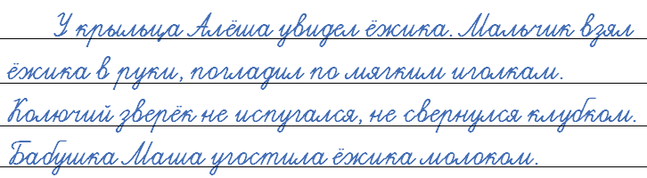 У крыльца Алёша увидел ёжика. Мальчик взял ёжика в руки, погладил по мягким иголкам. Колючий зверёк не испугался, не свернулся клубком. Бабушка Маша угостила ёжика молоком.