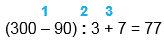 1) 300 - 90 = 210 2) 210 : 3 = 70 3) 70 + 7 = 77 |