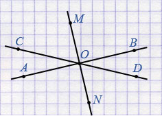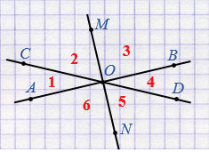 Проведите прямые АВ, СD и МN, которые пересекаются в точке О. На сколько частей делят плоскость три пересекающиеся прямые?